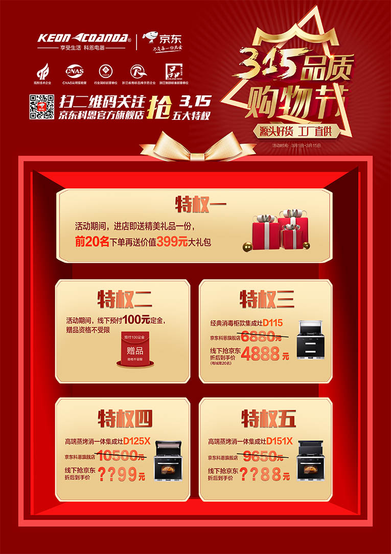 為感謝消費者們一直以來的支持,集成灶十大品牌、廚電行業(yè)十大品牌科恩電器315傾情奉獻,開啟“315品質(zhì)購物節(jié)”活動,開年第一大戲,科恩電器開誠相見,5大特權(quán)限時搶購,活動升級、火力全開!特權(quán)一:活動期間進店即送精美禮品一份,前20名下單再送價值399元大禮包;特權(quán)二:活動期間線下預(yù)付100元定金,贈品資格將不受限;特權(quán)三:經(jīng)典消毒柜款集成灶D115,線下?lián)尵〇|折后到手價僅需4888元;特權(quán)四:高端蒸烤消一體集成灶D125X、D151X,線下?lián)尵〇|折后到手價低至底價!多重優(yōu)惠一降到底,讓利價碼,牛轉(zhuǎn)乾坤!
