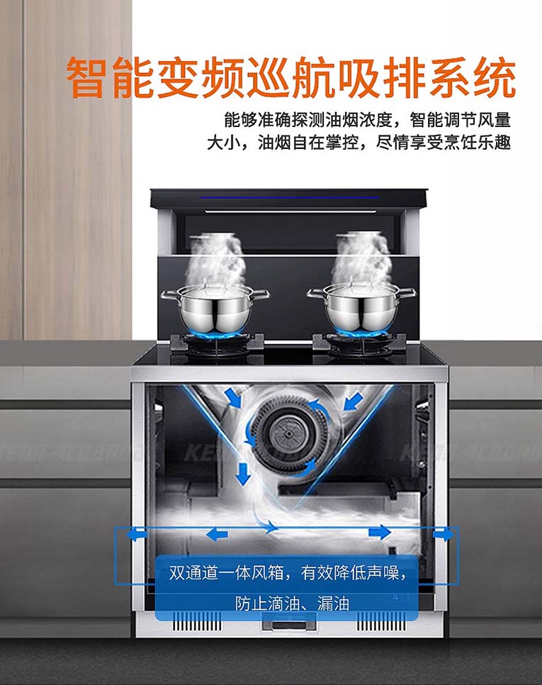 科恩D151X變頻大吸力集成灶功能實現(xiàn)多樣化,上炒下蒸烤能同時進行,蒸烤過程耗時短、效率高,噴氣式4D立體蒸技術保留了食物的原滋原味,采用智能變頻巡航吸排系統(tǒng),能夠準確探測油煙濃度,智能調節(jié)風量大小,油煙自在掌控,最大幅度減輕油煙排出的阻力和熱量,排油煙更通暢、更高效、更徹底,油煙吸凈率更高,讓油煙無處可逃。