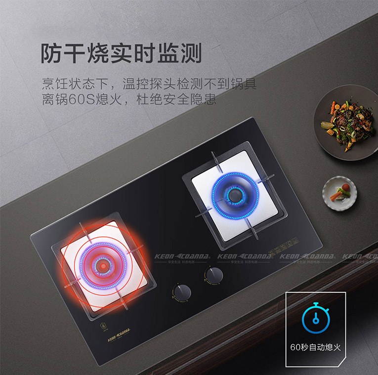 說起防干燒,其實是燃氣灶熄火保護裝置的一大技術突破,防干燒技術則是采用溫控傳感器和熱敏電阻感應的方式,搭配實時監測功能,這樣在使用時更顯智能化和人性化。相比市面上普通防干燒灶具,集成灶十大品牌、廚電行業十大品牌科恩KN610智能防干燒灶具技術更為優越,在溫度檢測上,普通防干燒在超過298℃后才能啟動熄火保護,而KN610在溫度達到280℃時就能斷氣,另外,烹飪狀態下,溫控探頭檢測不到鍋具60S時也將自動熄火,有效杜絕了安全隱患!