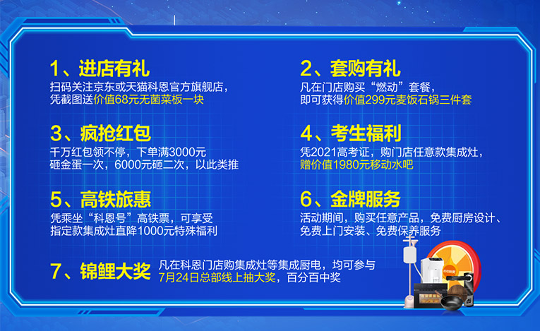 集成灶十大品牌、廚電行業(yè)十大品牌科恩燃動(dòng)七月舌尖之旅——邂逅幸福美味,七大特權(quán)享不停,進(jìn)店有禮:掃碼關(guān)注京東或天貓科恩官方旗艦店,憑截圖送價(jià)值68元無菌菜板一塊;套購有禮:凡在門店購買“燃動(dòng)”套餐,即可獲得價(jià)值299元麥飯石鍋三件套;瘋搶紅包:千萬紅包領(lǐng)不停,下單滿3000元即可砸金蛋一次,6000元砸二次,以此類推;考生福利:憑2021高考證,購門店任意款集成灶,贈(zèng)價(jià)值1980元移動(dòng)水吧;高鐵旅惠:憑乘坐“科恩號(hào)”高鐵票,可享受指定款集成灶直降1000元特殊福利;金牌服務(wù):活動(dòng)期間購買任意產(chǎn)品,可享受免費(fèi)廚房設(shè)計(jì)、免費(fèi)上門安裝、免費(fèi)保養(yǎng)服務(wù);錦鯉大獎(jiǎng):凡在科恩門店購集成灶等集成廚電,均可參與7月24日總部線上抽獎(jiǎng)。