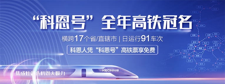 作為集成灶十大品牌、廚電行業(yè)十大品牌的科恩集成灶,杭紹臺高鐵的建成開通,開啟了科恩集成灶發(fā)展新篇章。2021年,斥資800萬,“科恩號”高鐵品牌專列馳騁大江南北,橫跨17個省/直轄市,日運(yùn)行91車次。