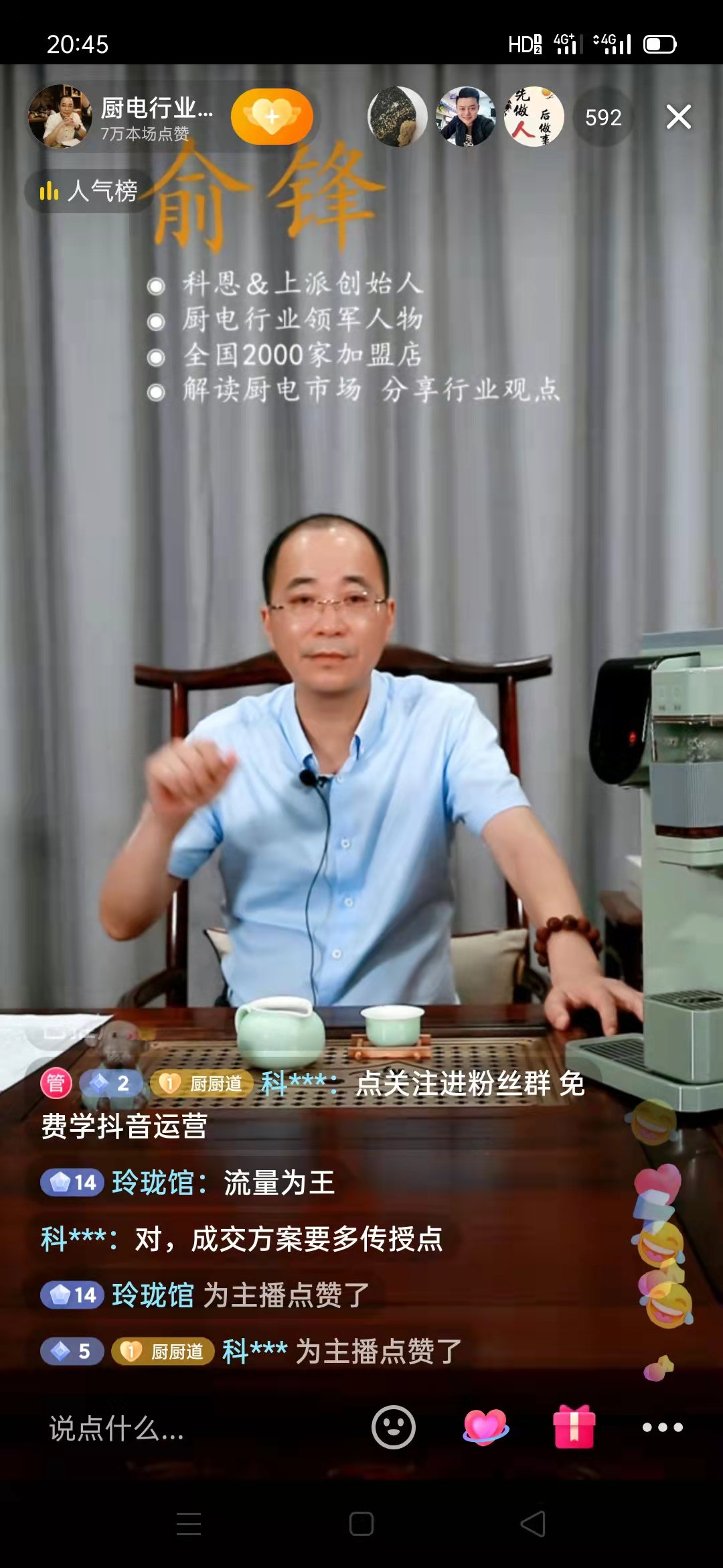 直播從19:30準時開始,俞總在大家的萬眾期待中閃耀亮相,集團董事、廚電大咖效應使得眾多業內外精英及投資創業者紛紛進入直播間聆聽取經,同時,豐富的直播福利和俞總娓娓道來、由淺入深的商業思維也提升了大眾的參與度,引起了用戶對于目前經濟形勢的廣泛關注和討論,可以說,這是一場具有戰略性、前瞻性、針對性的行業直播盛宴。