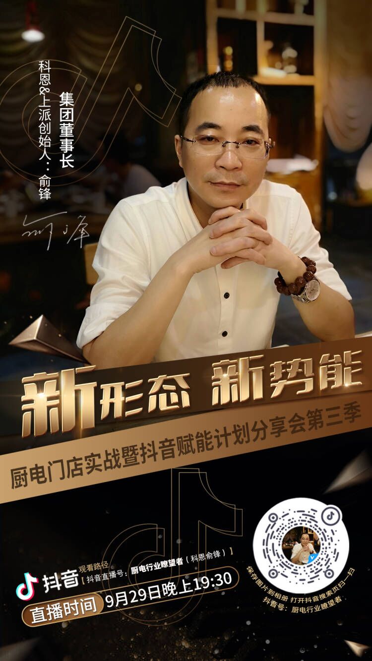 集團董事長、科恩&上派創(chuàng)始人俞鋒親自領(lǐng)軍征戰(zhàn)新零售流量變現(xiàn)風口,科恩新媒體事業(yè)中心資深團隊導師護航,助力廚電行業(yè)實體店打造線上引流線下獲客的私域裂變!9月29日19:30, 鎖定抖音直播間,董事長俞鋒親自掛帥,為您傾情分享新形態(tài)下實體店聚勢掘金新勢能!