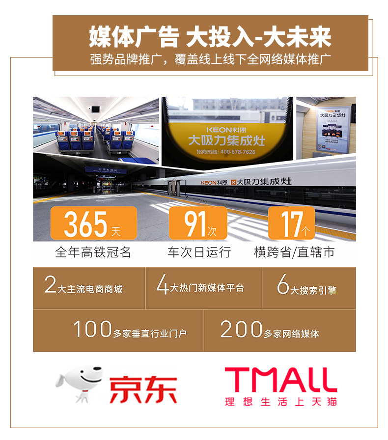 科恩集成灶自2021年以來全力加速品牌推廣進(jìn)程,大手筆投放高鐵廣告,斥巨資全年冠名——“科恩號”高鐵品牌專列:橫跨17個(gè)省/直轄市,日運(yùn)行91車次,傳播面積之廣,受及群眾之多,在消費(fèi)者心目中有著極強(qiáng)的影響力和公信力,借助高鐵“國家名片”屬性為品牌權(quán)威背書,讓“集成灶就選科恩大吸力”口號傳遍大江南北!如今,科恩電器再次重磅出擊,攜手嵊新高鐵站,強(qiáng)勢霸屏其黃金廣告C位,精準(zhǔn)覆蓋,持續(xù)品牌形象建設(shè),為品牌傳播助力加碼,實(shí)力詮釋“科恩速度”!