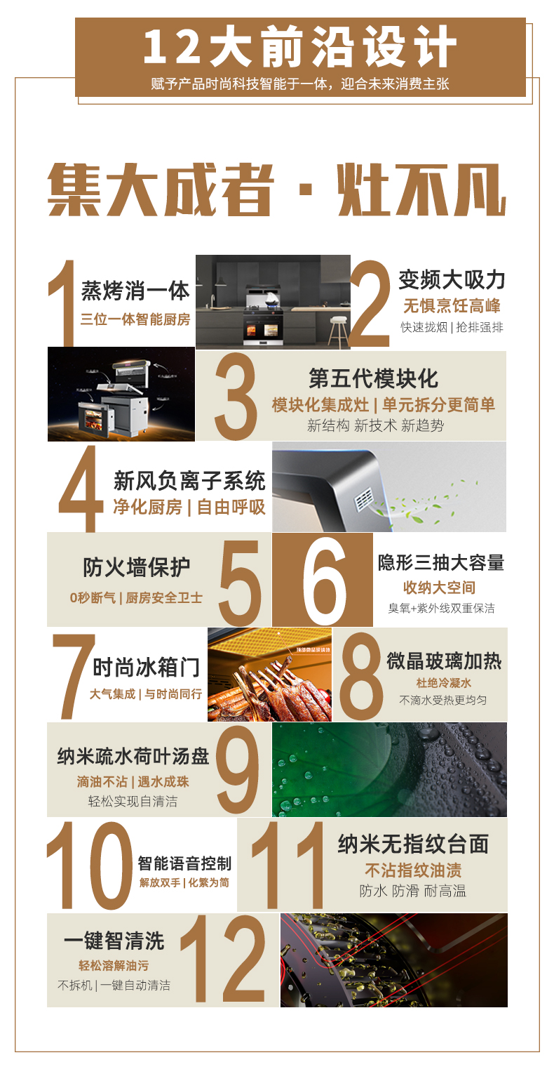 產(chǎn)品好不好,要看用戶的滿意度,科恩集成灶時(shí)刻洞察用戶需求變化,在產(chǎn)品研發(fā)上不斷發(fā)力,以變頻大吸力、第五代模塊化、智能語音互聯(lián)、蒸烤消一體、左右蒸烤、微晶玻璃加熱、納米疏水荷葉湯盤、納米無指紋臺面、一鍵智清洗等12大差異化前沿技術(shù),實(shí)現(xiàn)多項(xiàng)性能提升突破,為用戶帶去“樂享智慧烹飪”廚房新體驗(yàn)。