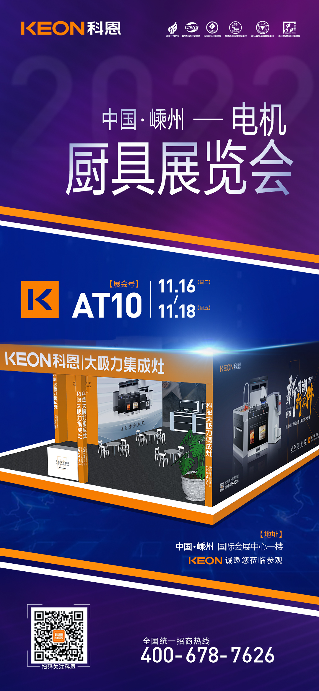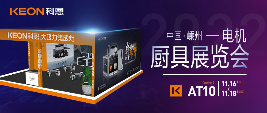 2022年11月16日-18日,第十五屆中國(嵊州)電機 ·廚具展覽會將在中國廚具之都——嵊州隆重開幕,科恩集成灶作為廚電行業領軍品牌受邀參加本次展會(展會號:AT10)
