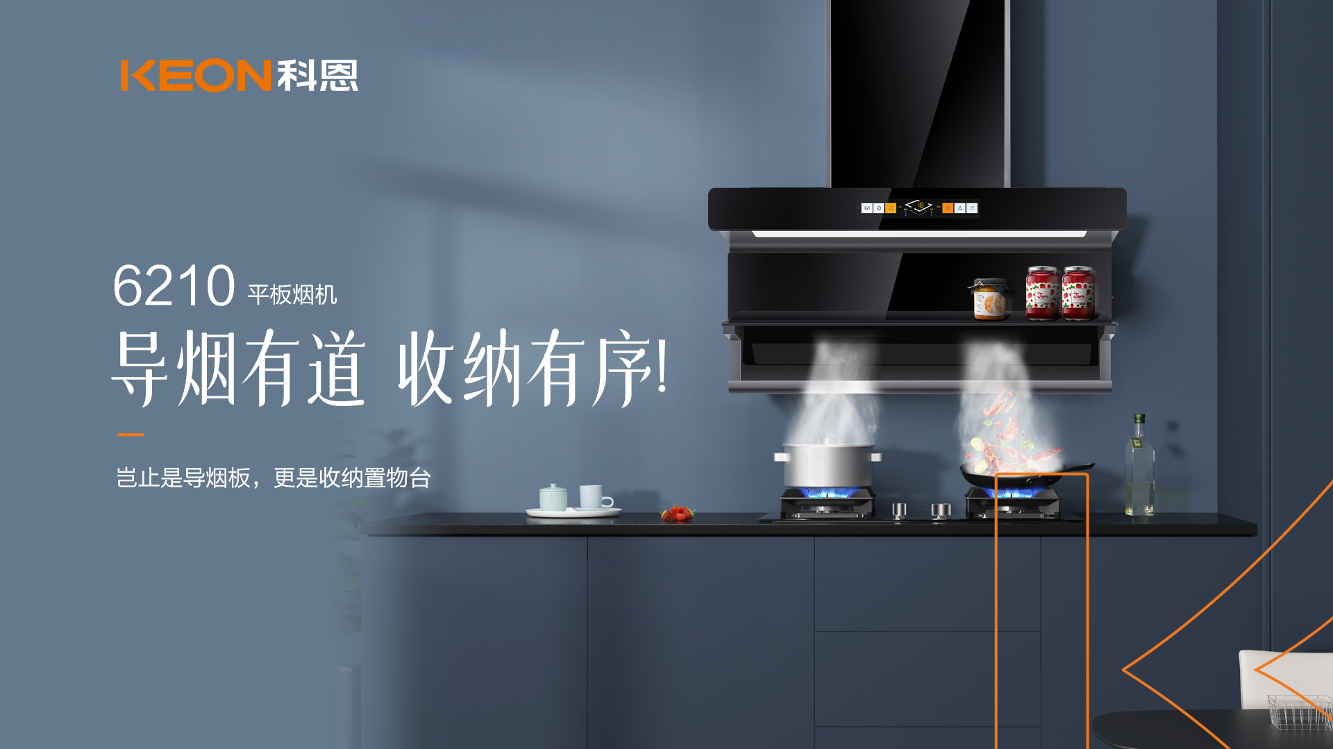 科恩平板煙機6210降低吸煙距離,采取低空爆吸,讓油煙在鍋口就被吸走!特制的導煙置物板,更是阻絕油煙向上跑的可能,徹底做到油煙不過臉。且在導煙同時,還能置物,烹飪時隨手置放的調(diào)味品有了好去處!
