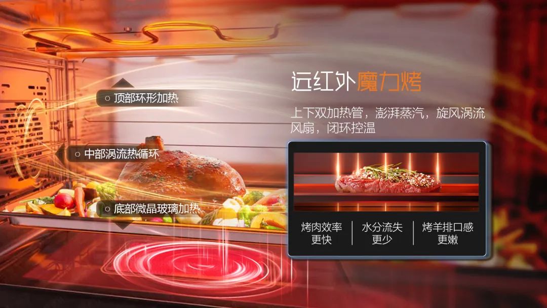 立體勻烤:頂部環(huán)形加熱管+循環(huán)風機+底部隱形加熱管,360度無死角烤制讓食材均勻受熱外酥里嫩烤的更專業(yè)。