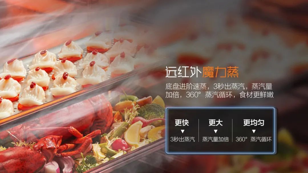 燒烤油炸固然美味,偶爾也需要來點養(yǎng)生蒸菜!A3系列采用底盤進階速蒸,3秒出蒸汽,蒸汽量加倍,360°蒸汽循環(huán),蒸的更美味!
