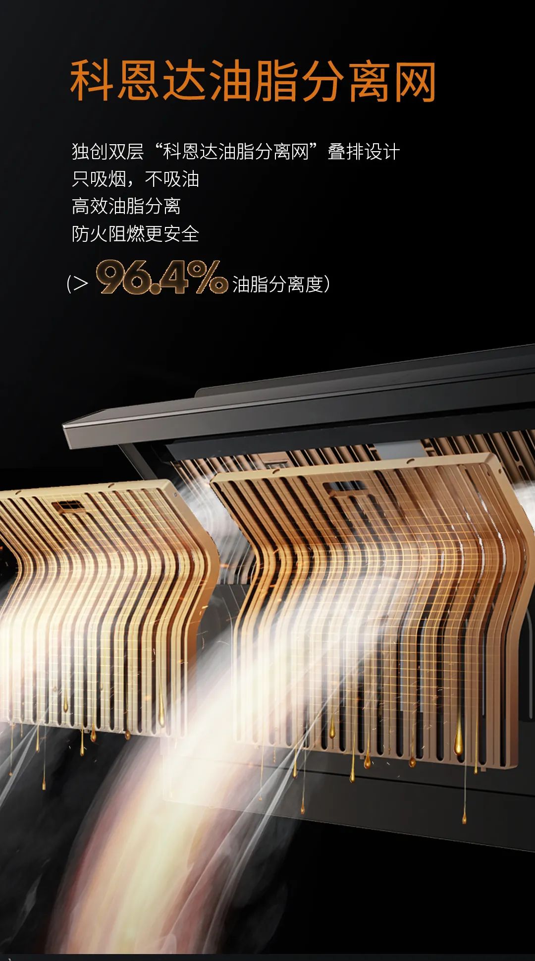 6K省心超體驗二:科學設計免清洗,耐用省心!科恩達油脂分離網完美實現煙機免清洗??贫鬟_油脂分離網可實現高效油脂分離,油脂分離率>96%,實現油脂不進門,煙機免清洗的理想狀態。