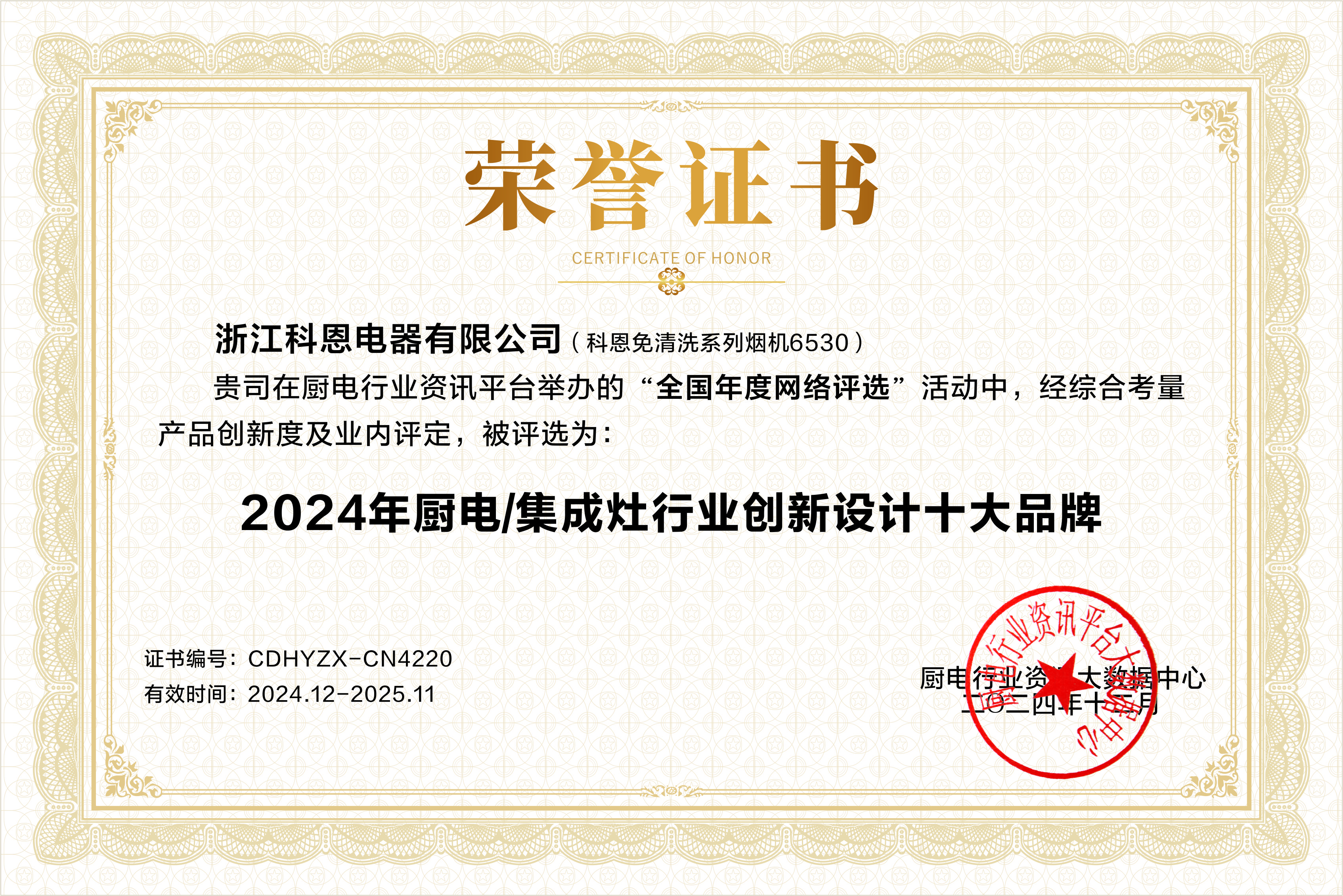 在眾多創新產品中,科恩6530免清洗煙機尤為引人注目。這款煙機憑借獨特的免清洗特質,有效解決了傳統煙機清洗困難的痛點,為消費者帶來了極大的便利。其創新性的設計不僅提升了產品的實用性,還在美學與功能的融合上達到了新的高度,榮獲“2024年廚電/集成灶創新設計十大品牌獎實至名歸。這一獎項的獲得,也充分彰顯了科恩電器在產品設計創新方面的領先地位。