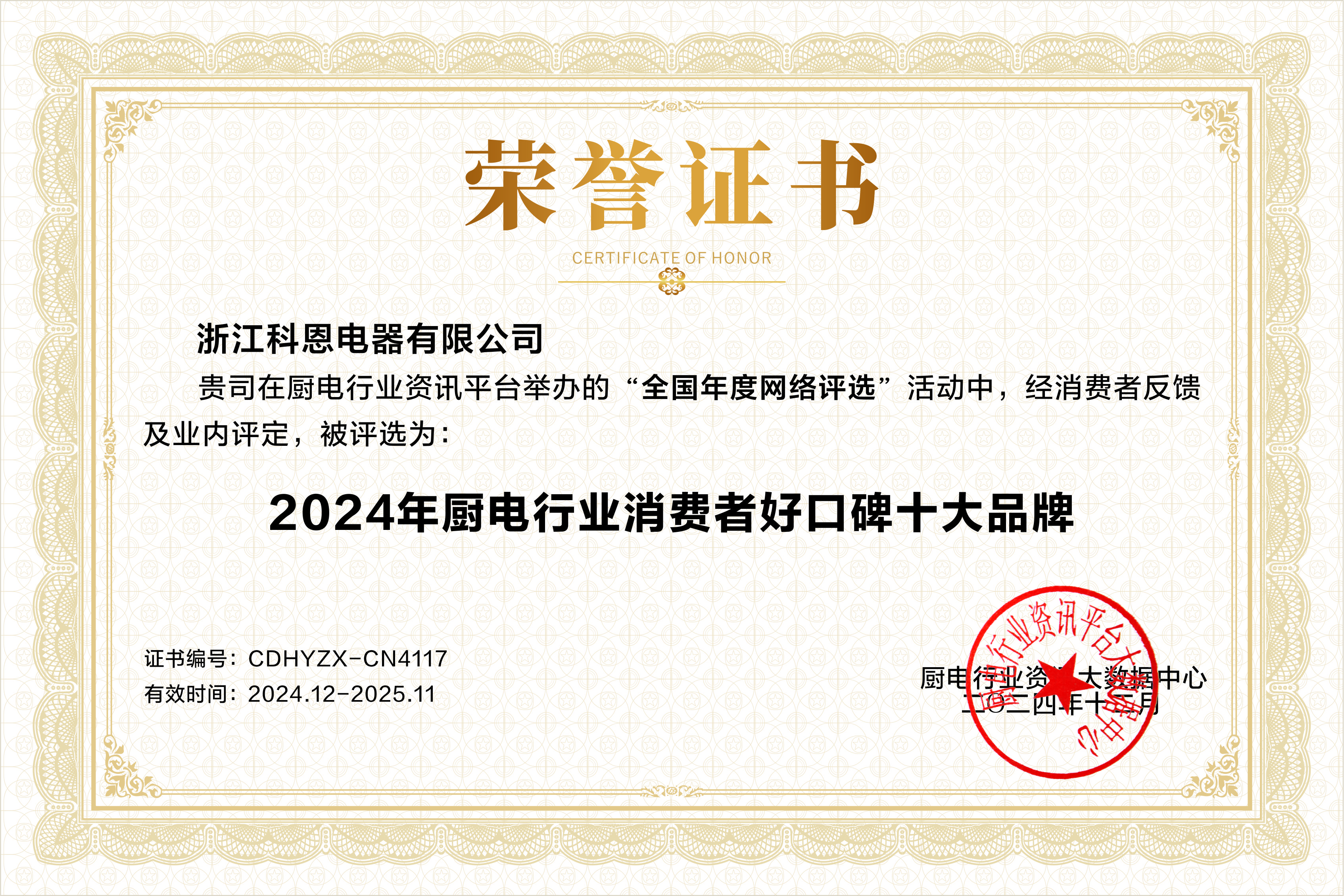 科恩電器長期致力于技術研發與創新,其國家級實驗室和龐大的研究團隊成為了企業不斷前進的核心動力源泉。在研發投入上不遺余力,使得科恩電器能夠精準洞察市場需求,推出一系列深受消費者喜愛的高品質廚電產品,進而在用戶群體中積累了深厚的認可和良好的口碑。此次榮獲廚電行業消費者好口碑十大品牌稱號,正是廣大消費者對其產品質量和服務的高度肯定。