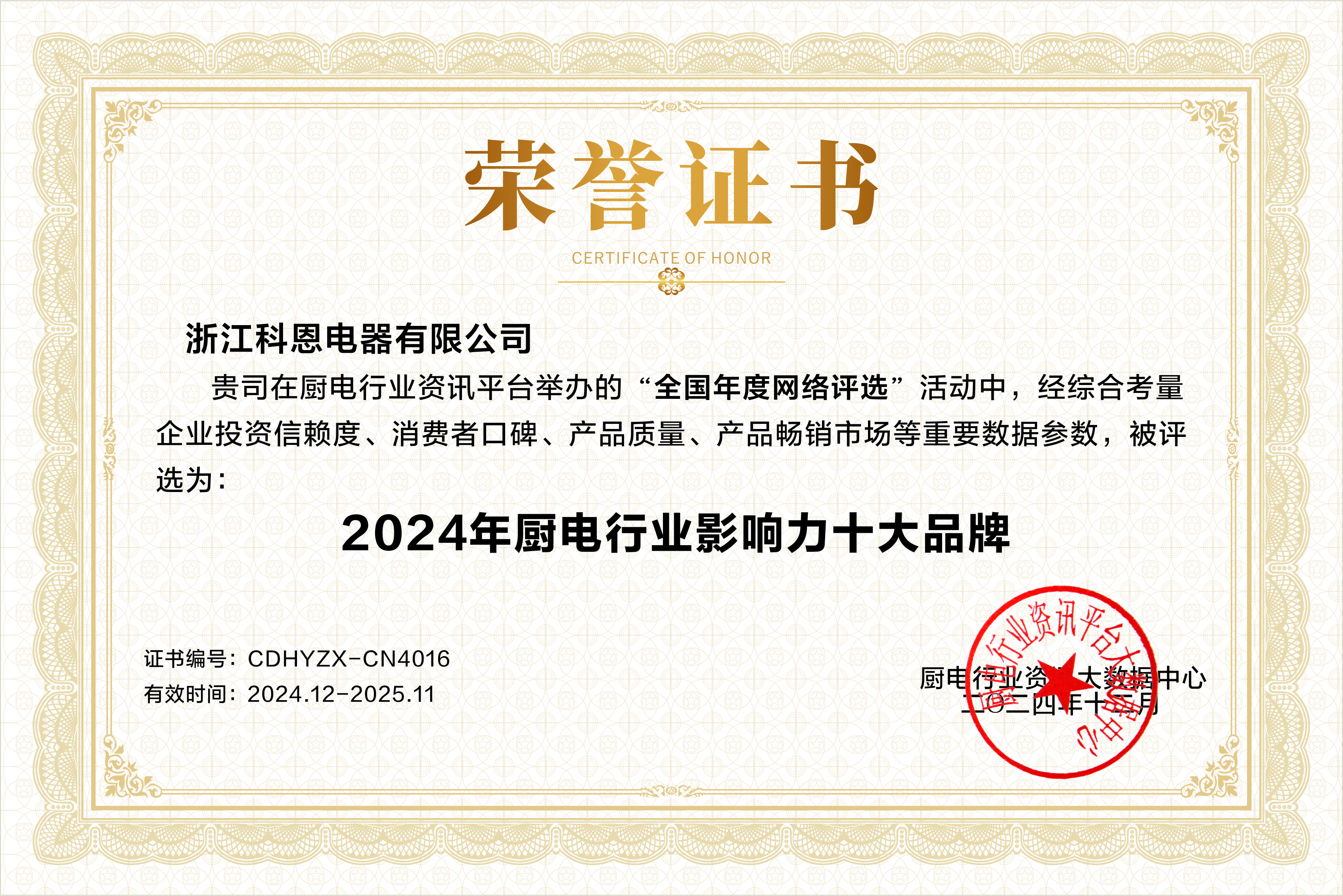 此次多項榮譽加身,對科恩電器而言既是鼓勵也是鞭策。未來,科恩電器有望憑借強大的研發實力和良好的用戶基礎,繼續深耕廚電市場,推出更多創新產品,進一步提升品牌競爭力,為消費者打造更加智能、便捷、高品質的廚房生活體驗,同時也為推動廚電行業的整體發展貢獻更多力量。