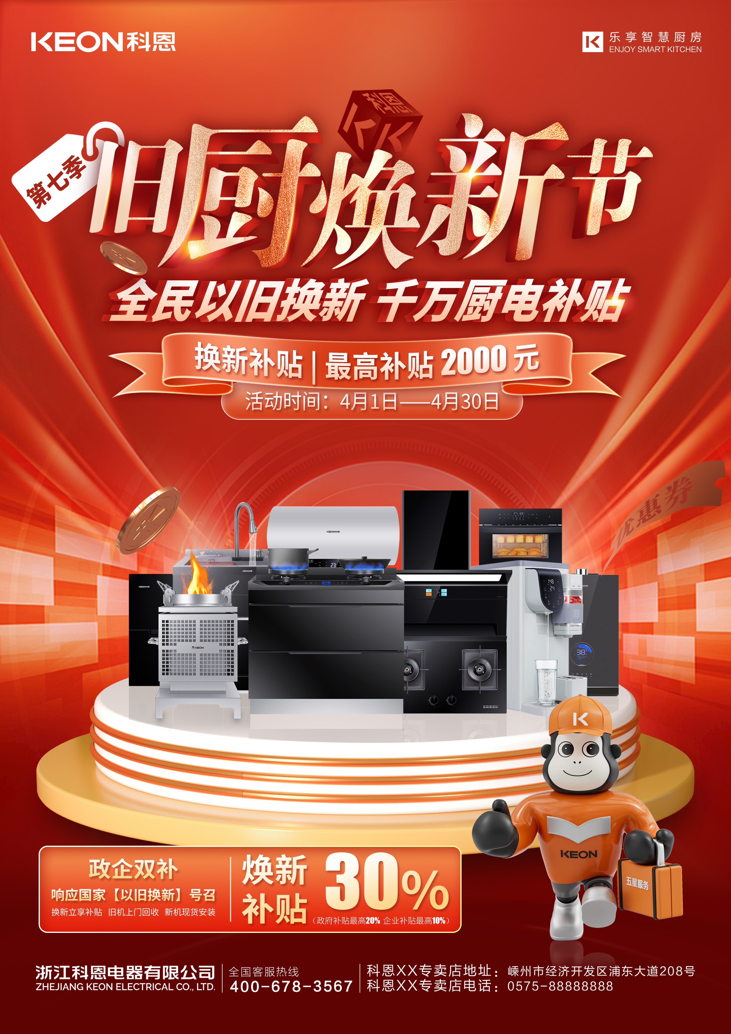 活動期間,科恩8年以上老用戶憑購買憑證可享受上門免費安檢服務。即刻前往科恩線下門店或官方線上商城,預約換新服務。科恩電器,始終陪伴在您和家人身邊,守護廚房每一刻。不再讓舊廚具拖累您的烹飪熱情,科恩電器助您廚房煥然一新。趕緊參與舊廚煥新活動,讓您的廚房跟上時代的步伐!