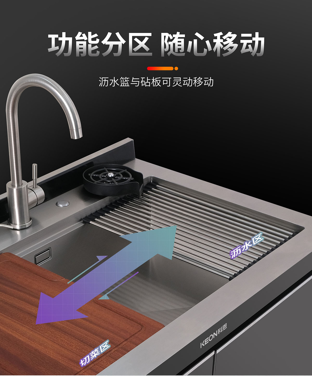 • 瀝水籃與砧板可靈動移動,功能分區,隨心移動