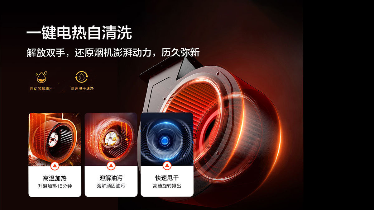 - 一鍵電熱自清洗,解放雙手,還原煙機澎湃動力,歷久彌新