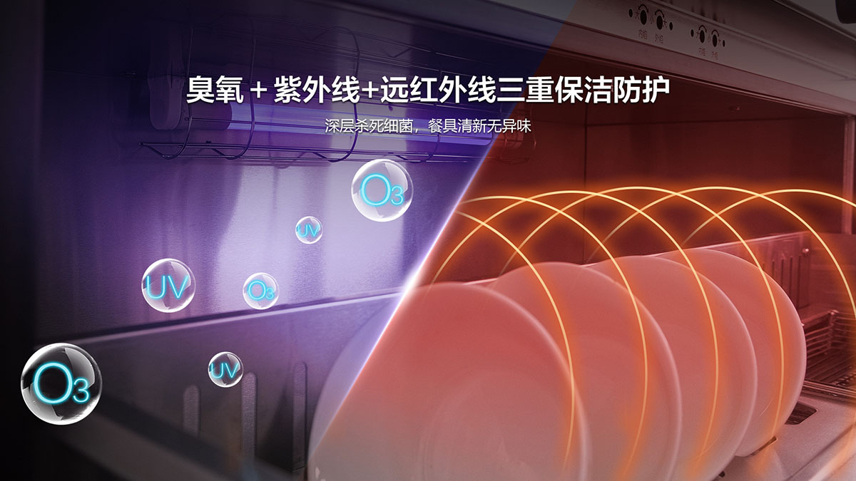 - 臭氧+紫外線+遠紅外線三重保潔防護,深層殺菌