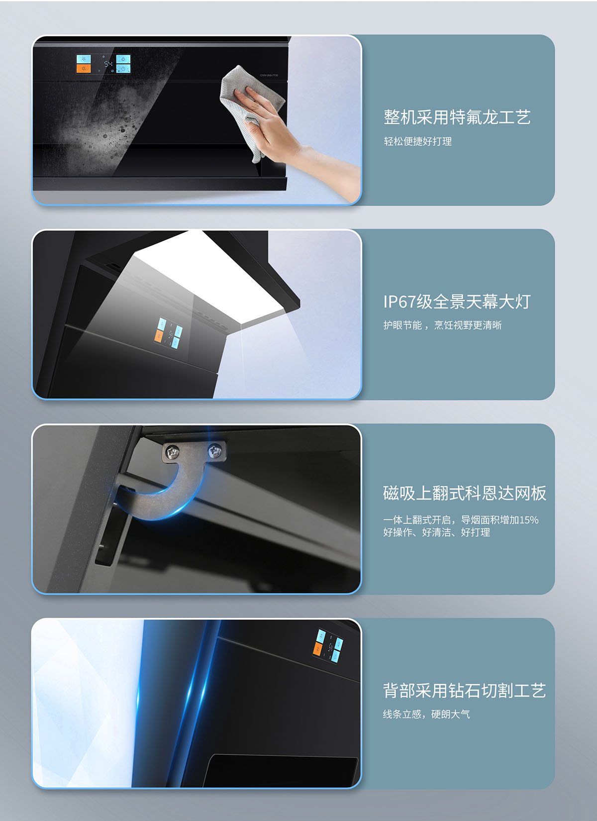 - 磁吸上翻式科恩達(dá)導(dǎo)煙板,減震防撞,清潔更便捷