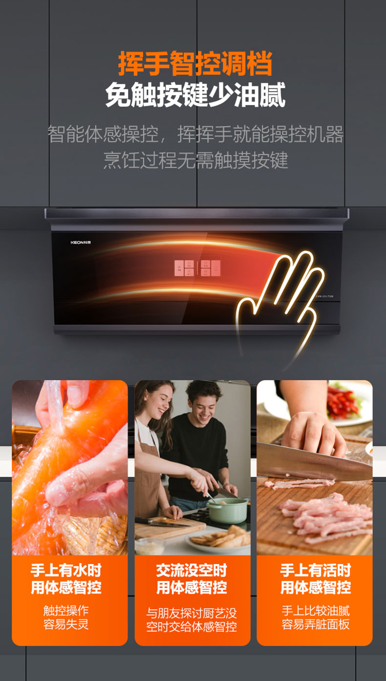 - 揮手智控,零觸碰調(diào)節(jié)操作面板,讓油污不沾手