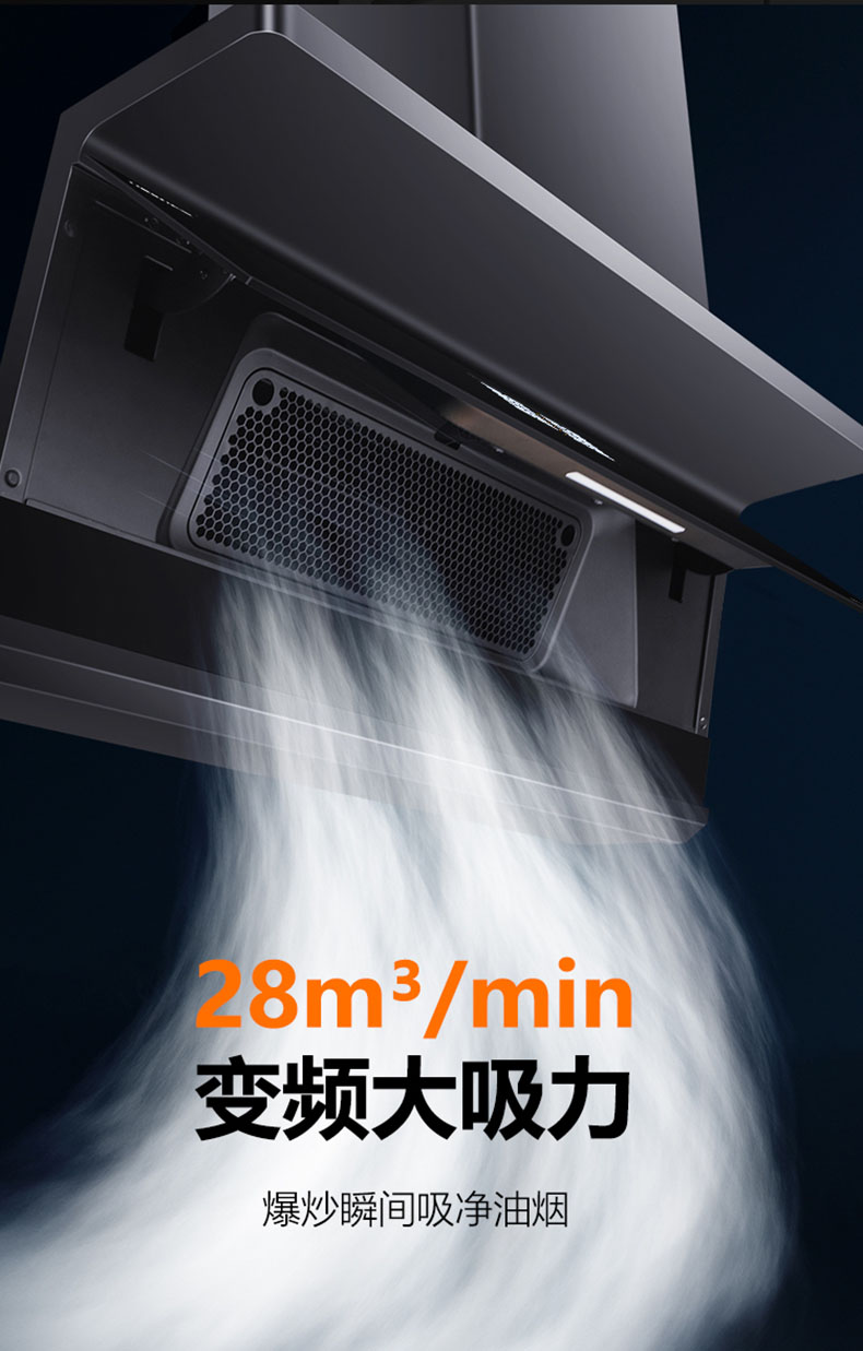 - 28m³/min颶風(fēng)吸力,爆炒瞬間吸凈油煙